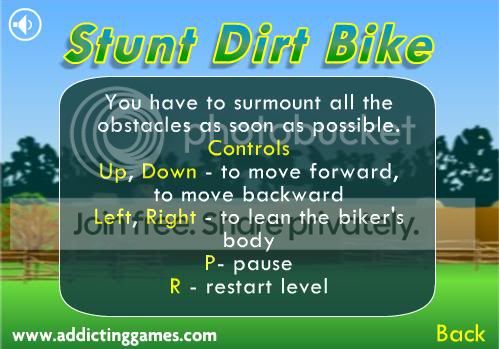Stunt Dirt Bike is a new fun flash game. You can do your thing on two or four wheels, it's up to you. Use the arrow keys to traverse you vehicle through various obstacles to get to the next level. If you get stuck on a level try changing your vehicle choice, each vehicle has its own advantages.